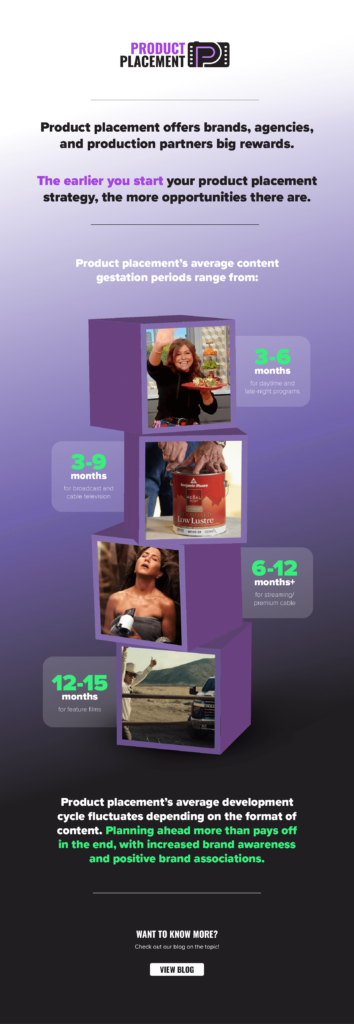 Depending on the type of content (broadcast, daytime, cable and premium cable, streaming, or feature film) you’re considering for you’re brand’s product placement strategy, gestation periods can vary from just a few months to a year plus. While it may seem like a lengthy process, your product placement agency and production teams have it down to a science.